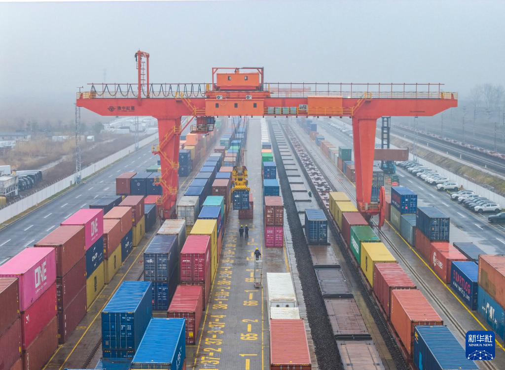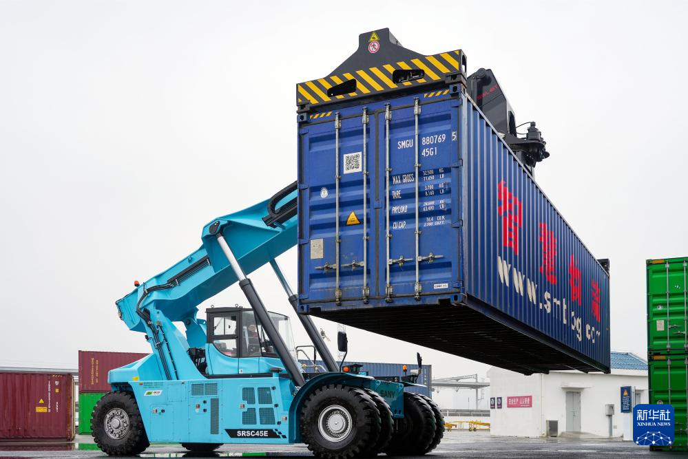 3月16日,工作人员在南京铁路物流中心江都物流基地转运集装箱。