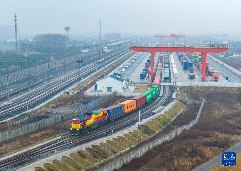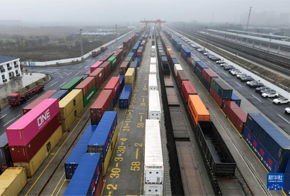 3月16日,满载外贸货物的集装箱班列从南京铁路物流中心江都铁路专用线发车。
