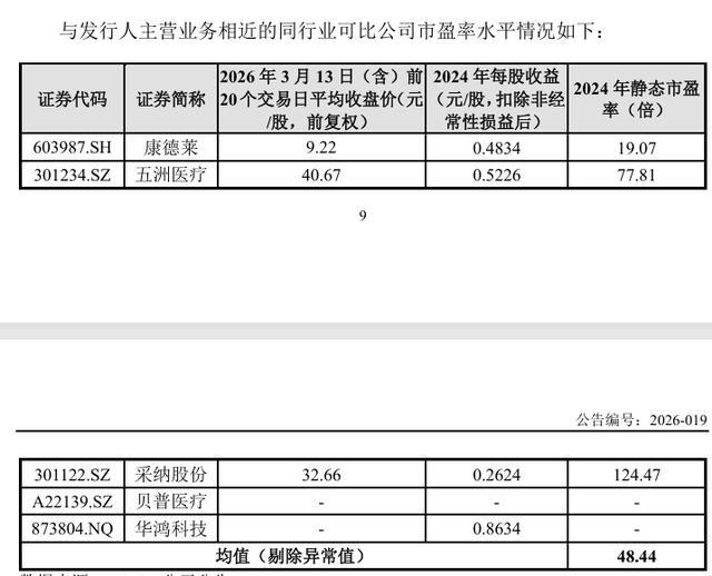普昂医疗发行前总股本4233.12万股,非限售流通股525.32万股。本次拟发行1058.28万股,战略配售比例10%,共105.828万股,扣除战略配售后网上发行952.452万股。本次发行价18.38元,单账户申购上限47.62万股,对应申购资金875.2556万元。按2024年和2025年扣除非经常性损益后净利润计算发行市盈率分别为14.53倍和11.51倍,行业静态市盈率43.57倍,公司招股说明书选取的几家可比公司平均静态市盈率48.44倍,其中康德莱静态和动态估值都是最低,分别为19.07倍和16.5倍,主要其规模已较大,毛利率比普昂医疗低了约20个点;而另2家公司由于处于微利状态,估值不正常,已无多大参考价值。